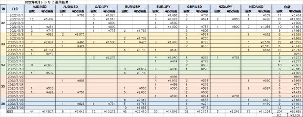 1日の平均決済は8.2回、確定損益は¥3,706でした。小さな利益幅でも積み重ねでちゃんとした結果になり、ホクホクです。