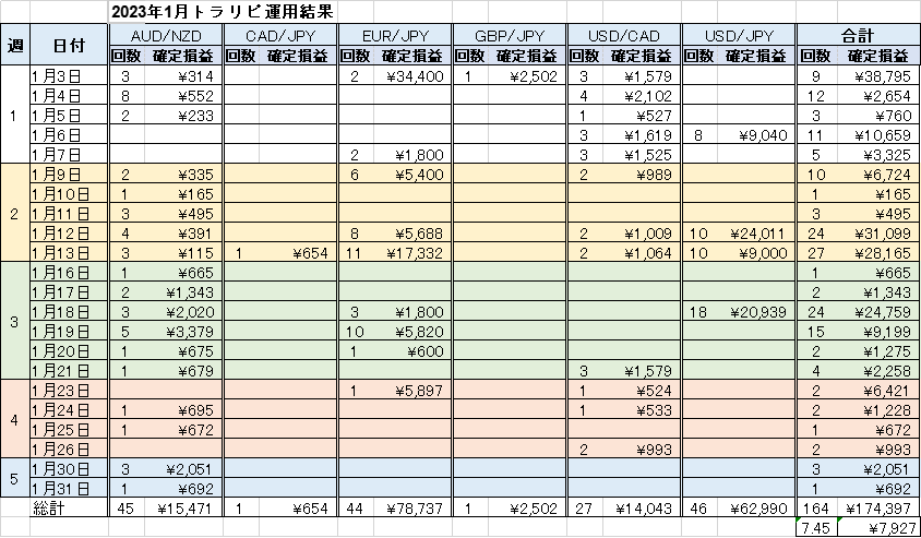 1日の平均決済は7.45回、確定損益は¥7,927でした。裁量もありますが、トラリピで毎日のように決済がありました。通知が来るのが楽しくなっています。