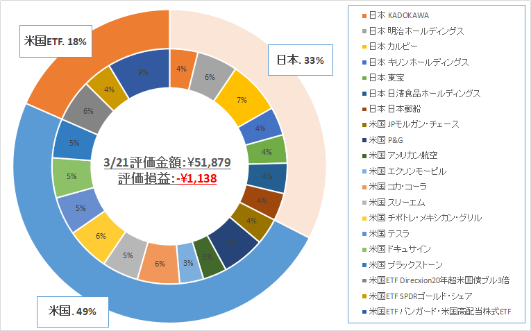 割合としては、米国株:49%、日本株:33%、米国ETF:18%となっております。