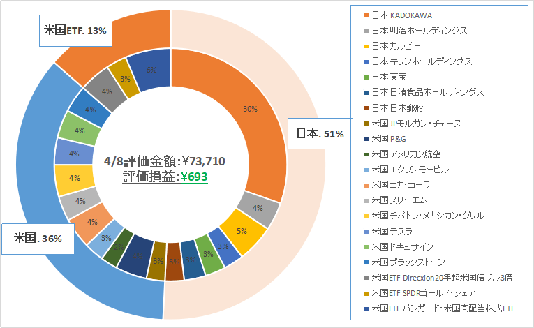 3月末にKADOKAWAを¥20,000分購入したので、日本株の割合が上がっています。これはこれで日本株、米国株&ETFで半分ずつなので、バランスが良い気もします。