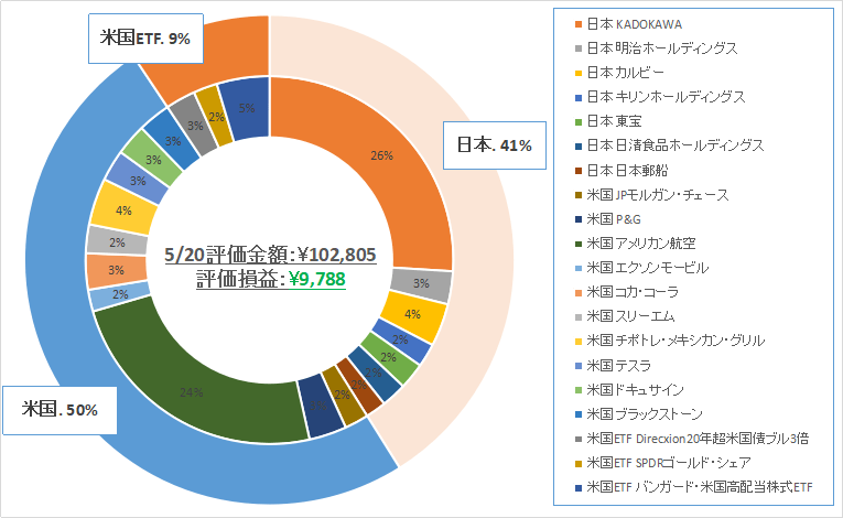 割合としては、日本株:41%、米国株:50%、米国ETF:9%となっております。