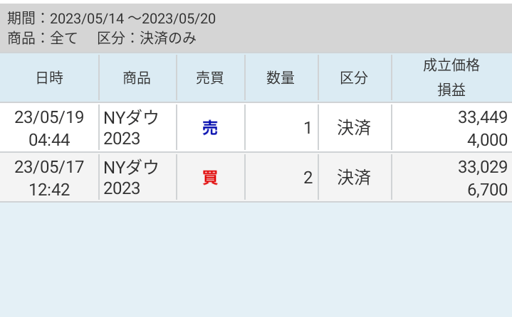 今週は債務上限問題はいったん下がりましたが、回避できそうということで、一転して堅調に推移しました。売りの裁量で持っていたポジションだけ反転前に利確しました。