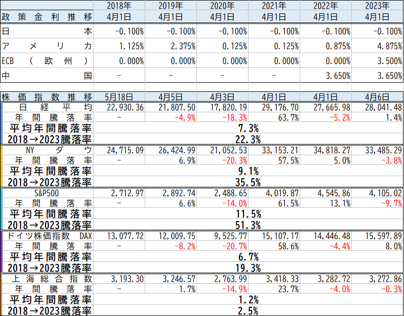 1年ごとに政策金利と株価指数をピックアップして比較表にしました。表から考察できることをまとめます。