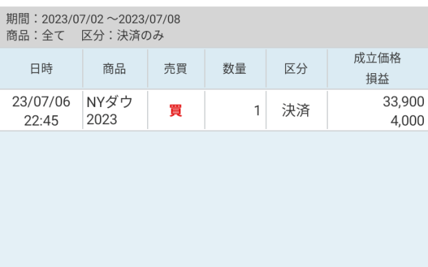 今週は1件NYダウで決済はありました。米国株は全体的に強気相場でしたが7/6以降は下げていますね。利上げする材料が出てきたので売りが出ているのでしょうか?