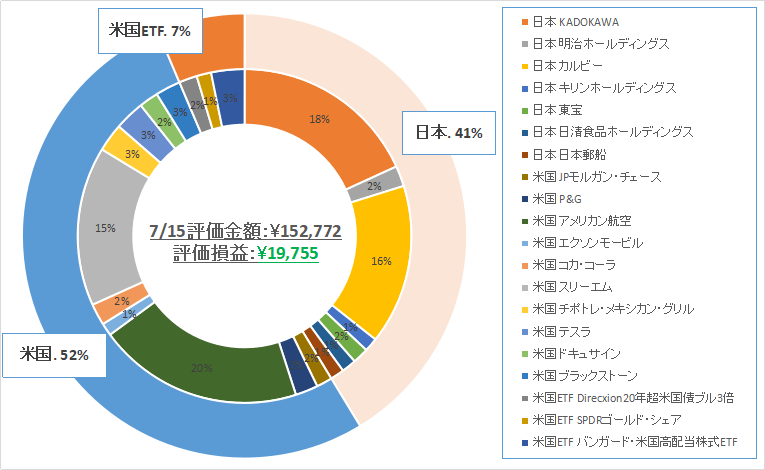 割合としては、日本株:41%、米国株:52%、米国ETF:7%となっております。