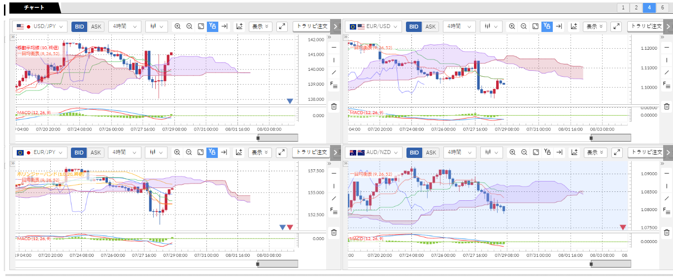 4時間足で、米ドル/円、ユーロ/円、ユーロ/米ドル、AUD/NZDを並べています。クロス円はチャートの推移が似ていますが、ユーロ/米ドルでは雲より下に位置しているので、米ドル>ユーロ>円の強弱になっています。