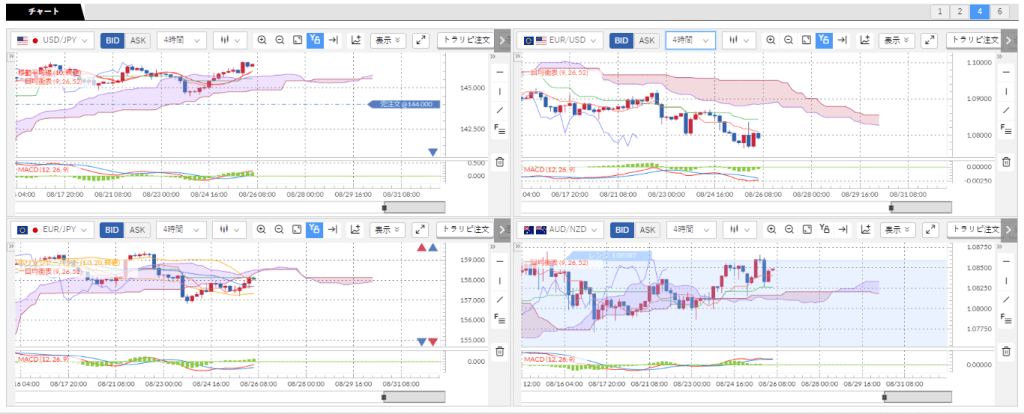 4時間足で、米ドル/円、ユーロ/円、ユーロ/米ドル、AUD/NZDを並べています。クロス円はチャートの推移が似ていますが、ユーロ/米ドルでは雲より下に位置しているので、米ドル>ユーロ>円の強弱になっています。