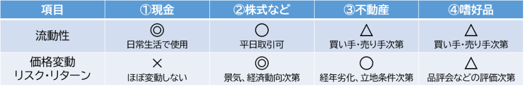 ①、②などはペーパーアセットともいわれる資産になります。仮想通貨も意味合いとしては②の株式にも近いイメージですね。 変わって、 ③、④は一点ものであったり実際に品物があるものなので、ハード(リアル)アセットなどと言われています。最近話題のNFTはデジタルアートなので意味合いとしては④に区分けできそうですね。 それぞれの資産は流動性(売買、現金化しやすいか)や、価格の変動性(リスク・リターン)などで違いがありますね。 個人的な体感ですが、貯金や株式などのペーパーアセットは流動性(現金化しやすいか)が良くて、価格は変動しやすい印象です。逆にハードアセットは流動性は悪くて、価格は変動しにくい感覚です。