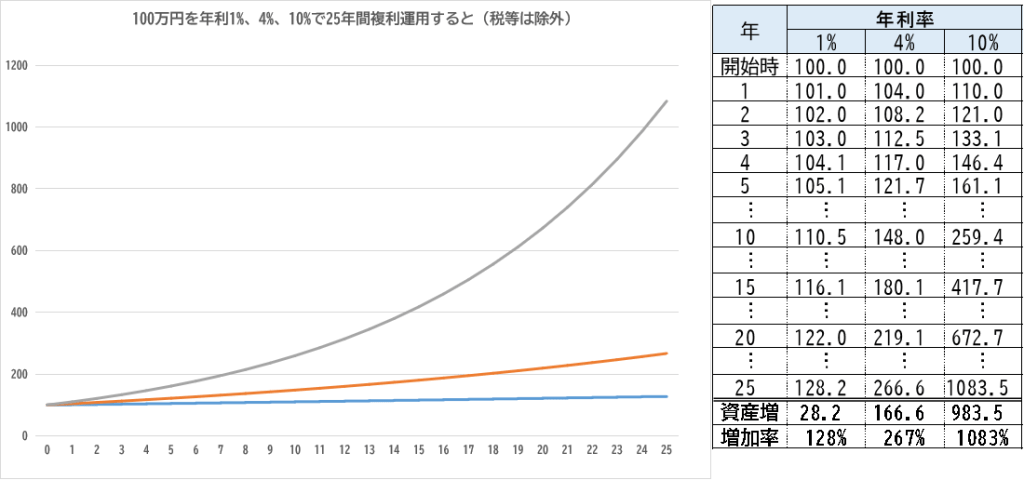 100万円を年1%、4%、10%で複利運用を25年間行った場合の資産増加の違いを比較してみます。