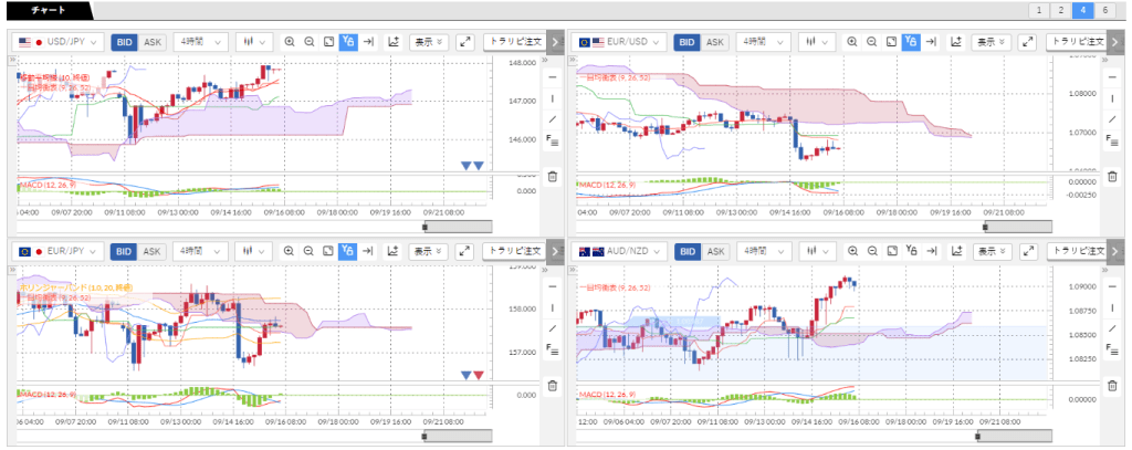 4時間足で、米ドル/円、ユーロ/円、ユーロ/米ドル、AUD/NZDを並べています。クロス円はユーロが大きく下がってきて雲の下に抜けました。上がっても雲は抜けず利上げ発表後には下がっています。ユーロ/米ドルでも雲より下に位置しているので、ユーロは明確に弱くなってきていますね。米ドル>ユーロ≧円の強弱になっています。