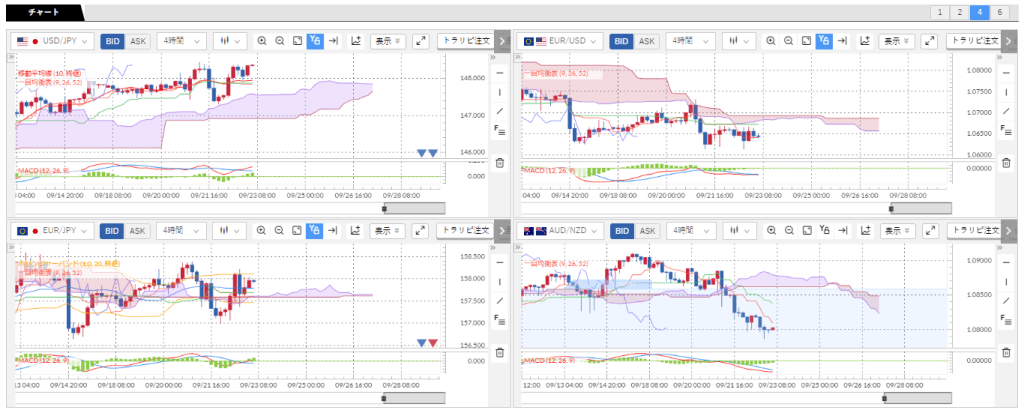 4時間足で、米ドル/円、ユーロ/円、ユーロ/米ドル、AUD/NZDを並べています。クロス円はユーロが雲の上に抜けました。ユーロ/米ドルでも雲より下に位置しているので、ユーロは明確に弱くなってきていますが、円は金融緩和政策維持が改めて発表されたので、円も弱くなっていますね。米ドル>ユーロ>円の強弱になっています。
