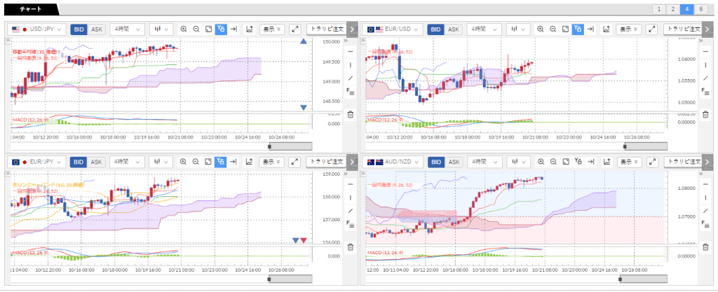 4時間足で、米ドル/円、ユーロ/円、ユーロ/米ドル、AUD/NZDを並べています。クロス円はユーロが雲の上に抜けました。ユーロ/米ドルでも雲より上に抜けて推移しているので、ユーロは強め、ドルは対ユーロに対しては弱めでした。ユーロ≧米ドル>円の強弱関係になっています。