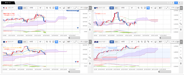 4時間足で、米ドル/円、ユーロ/円、ユーロ/米ドル、AUD/NZDを並べています。クロス円はユーロが雲の中に潜ってきております。ユーロ/米ドルも先週は上昇しておりましたが、今週に入って雲の下に位置しているので、ユーロは弱くなってきています。米ドル>ユーロ>円の強弱になっています。
