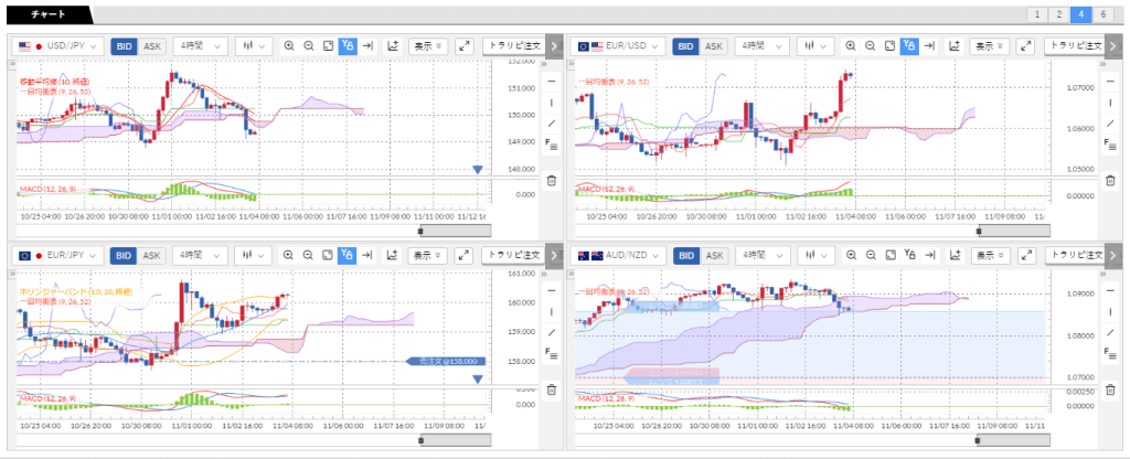 4時間足で、米ドル/円、ユーロ/円、ユーロ/米ドル、AUD/NZDを並べています。クロス円はユーロが雲の上に飛びぬけました。ユーロ/米ドルも先週は上昇しておりましたが、今週に入って雲の上に位置しているので、米ドル、日本円が弱くなってきています。ユーロ>米ドル>円の強弱になっています。