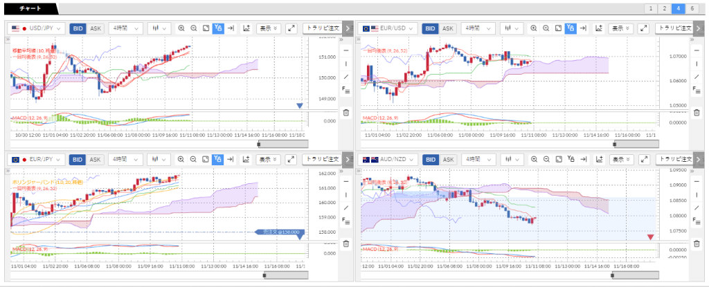 4時間足で、米ドル/円、ユーロ/円、ユーロ/米ドル、AUD/NZDを並べています。クロス円は米ドル、ユーロとも雲の上に上がってきております。ユーロ/米ドルも先週は下がっておりましたが、今週に入ってからはレンジワークして雲の中に位置しています。米ドル=ユーロ>円の強弱関係になっています。