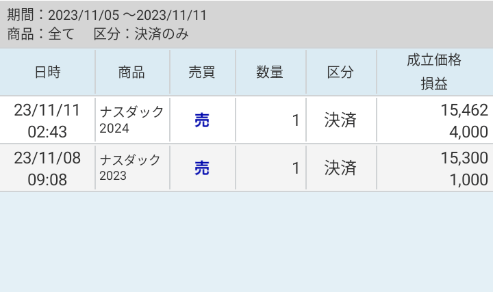 利益確定売りで下がるかと思いましたが、先週の雇用統計の結果を好感してかなり調子が良かったですね。24年度で設定したトラリピで1件決済しました。1件は設定間違えて裁量で買ってしまった分で慌てて決済した分です。年末は23年と24年のどちらも注文できるので気を付けないと(^^;)