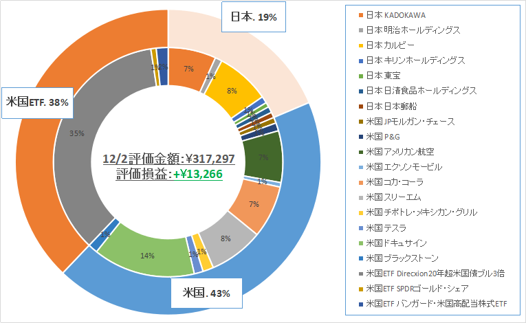 割合としては、日本株:19%、米国株:43%、米国ETF:38%となっております。