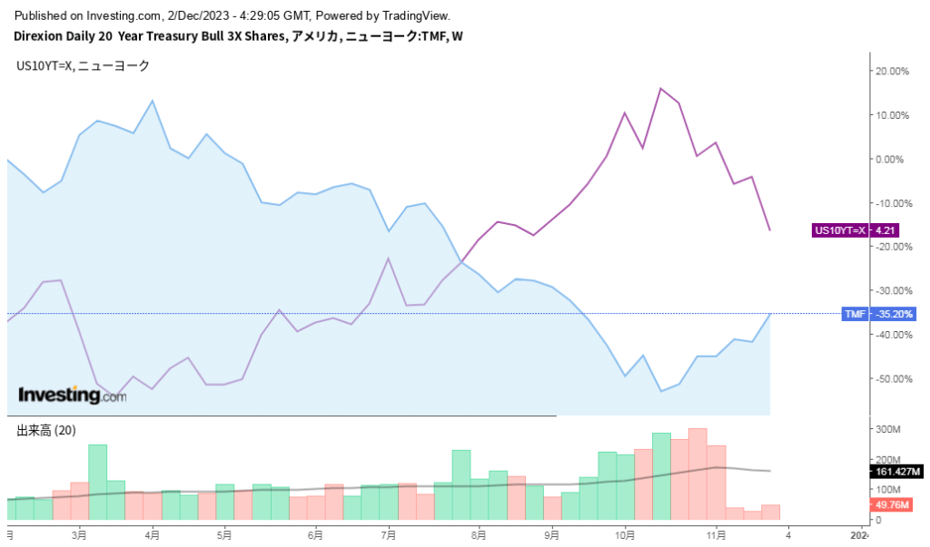 ↓のチャートはTMF(青ライン)と米国債10年金利(紫ライン)のここ1年ほどのチャート推移と出来高になります。