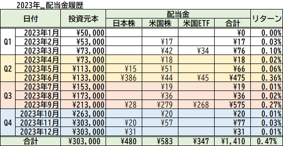 配当金は、米国株と日本株、米国ETFからの配当相当金が毎月で入金があります。