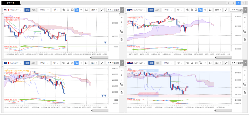 4時間足で、米ドル/円、ユーロ/円、ユーロ/米ドル、AUD/NZDをチャート推移を並べています。クロス円は米ドル、ユーロとも雲の下に抜けております。ユーロ/米ドルは今週上昇・下降で雲の下に抜けていますね。円>米ドル>ユーロの強弱関係になっています。