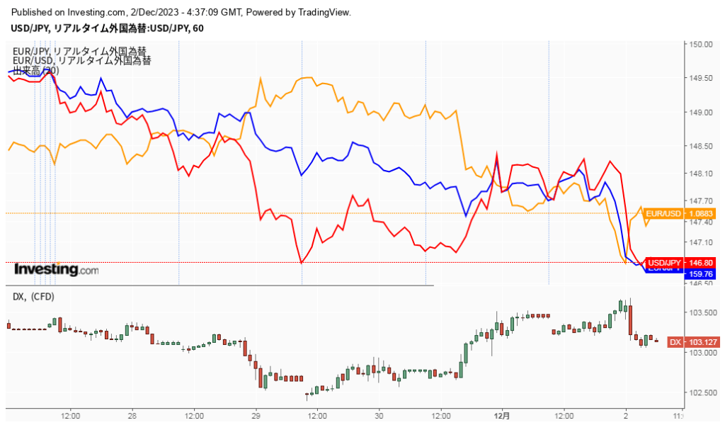 先週からの米ドル売りが継続していきました。米ドル/円で見てみると、先週末に149.50近くまでありましたが、じりじりと下がってきておりますね。金曜の取引終了の段階で146.80近くまで戻しております。