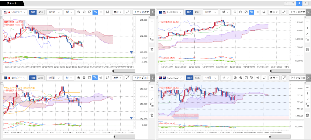 4時間足で、米ドル/円、ユーロ/円、ユーロ/米ドル、AUD/NZDをチャート推移を並べています。クロス円は米ドルは引き続き雲の下に抜けており、ユーロも下に抜けています。ユーロ/米ドルは雲の上に抜けていますね。円>ユーロ>米ドルの強弱関係になっています。