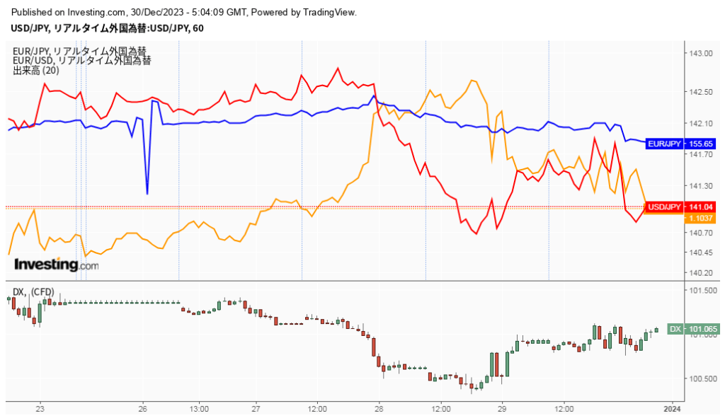 先週からの米ドル売りが継続していきました。米ドル/円で見てみると、先週末に142.16近くまでありましたが、金曜の取引終了の段階では141.04近くまで下がってきています。
