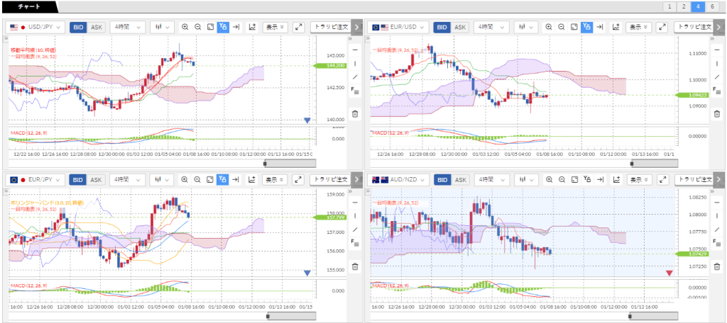 4時間足で、米ドル/円、ユーロ/円、ユーロ/米ドル、AUD/NZDをチャート推移を並べています。クロス円は米ドルとユーロも雲の上に抜けております。ユーロ/米ドルは雲の下に抜けていますね。ユーロ>米ドル>円の強弱関係になっています。