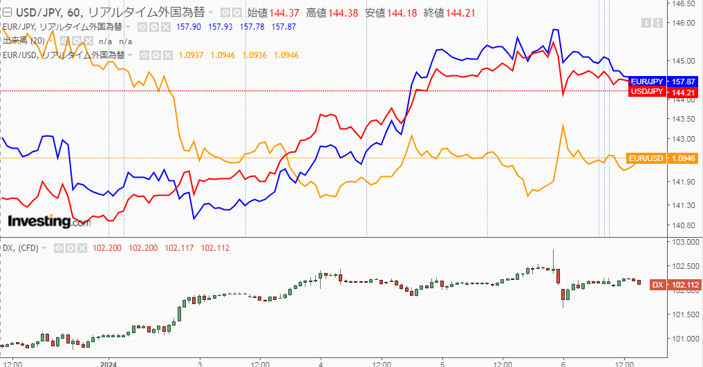 先週からの米ドル売りが継続しているものの、日本円が売られている相場となりました。2024/1/1に発生した石川県の大地震から、金融緩和策→金融引締め策への転換がもっと遅くなるとの見方が広がったためです。米ドル/円で見てみると、先週末に141.04近くまでありましたが、金曜の取引終了の段階では144.21近くまで上がっています。