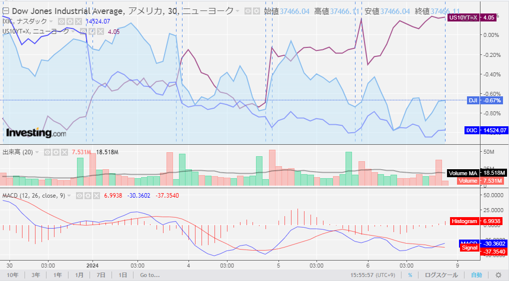 今週の米国市場は全体的に軟調でした。FOMCの議事要旨の公開や雇用統計などの指標発表がありましたが、利下げの開始時期がまだまだ先になりそうという憶測から特にナスダックが下げていきました。