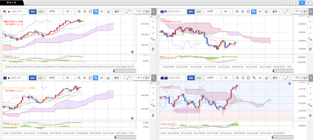 4時間足で、米ドル/円、ユーロ/円、ユーロ/米ドル、AUD/NZDをチャート推移を並べています。クロス円は米ドルとユーロも先週に引き続き雲の上に抜けております。ユーロ/米ドルは雲の下に抜けていますね。米ドル>ユーロ>円の強弱関係になっています。