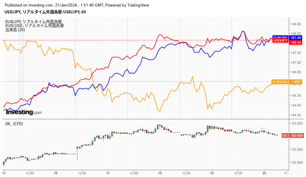 チャート推移をもう一つ比較用で掲載します。比較するなら大きい画像で見たほうが見やすいですし、上のチャートのなかで相関関係にある、米ドル/円、ユーロ/円、ユーロ/米ドルを重ねて表示しています。こちらは1時間足で一週間分にまとめました。