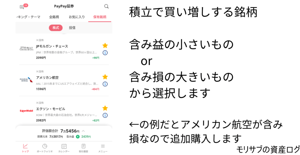 積立日がきたら、PayPay証券のアプリを開いて保有している銘柄のなかで含み益の小さい(もしくは含み損の大きい)銘柄を探します。銘柄を見つけたら積立金額を割り当てて購入をしていきます。こうすることで購入銘柄のなかでもっとも割安な銘柄を購入していくことになります。保有銘柄の平均購入単価を下げていきますので、株価が上昇していくと含み益を増やしやすくなります。