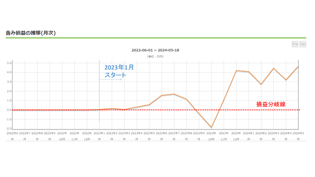この積立投資戦略を開始したのが2023年1月からになります。2023年9月~11月で一時的にマイナスになっていますが、それ以降は含み益の中で推移できています。