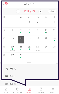 カレンダー、取引履歴メニューでは、日付ごとの取引情報を確認することができます。グラフだったりと視覚的にもわかりやすいと思います。
