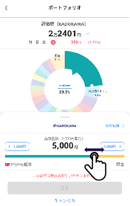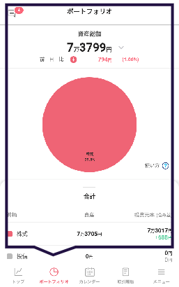 アプリの下部に配置されたポートフォリオをタップすると、現在持っている資産の内訳が円グラフで表示されます。