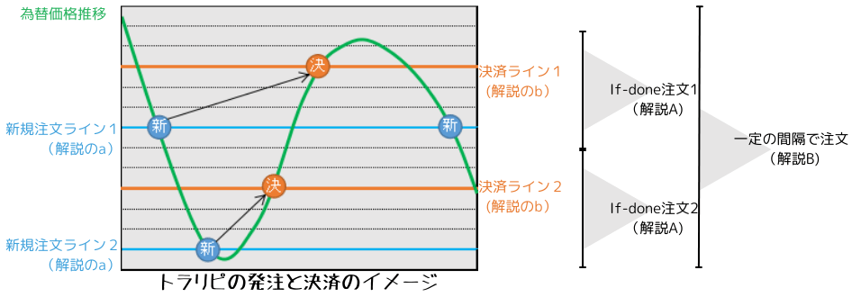 ある特定の価格の範囲に対して、イフダン(If-done)注文を一定の値幅で連続で注文(トラップ)し、新規注文と決済注文を繰り返し(リピート)行う。